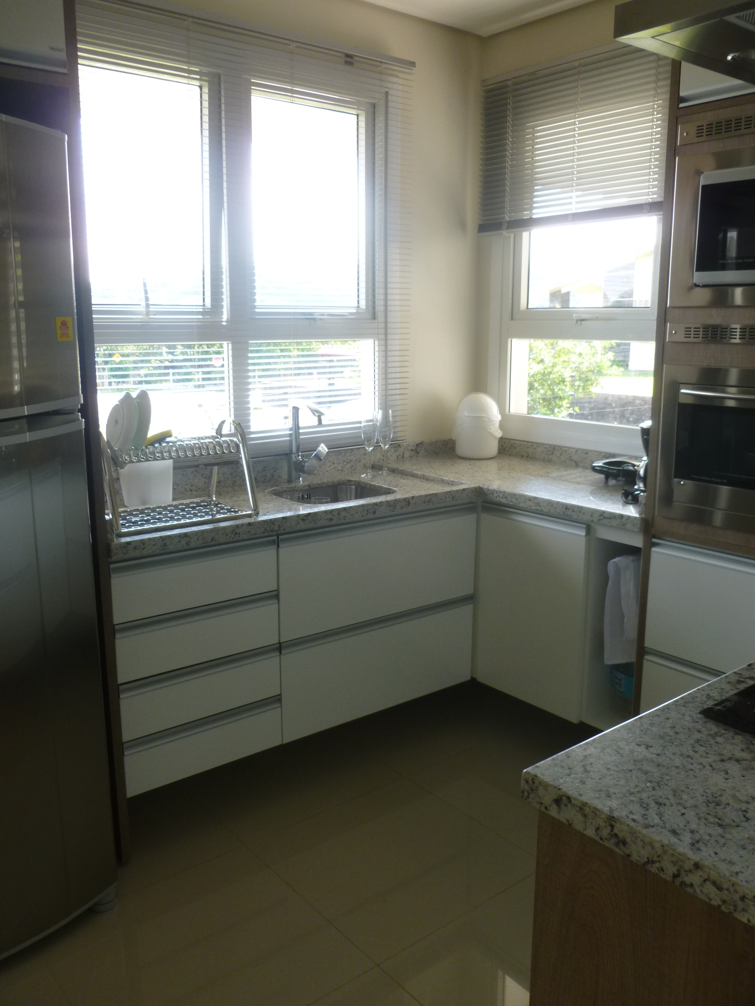 Cozinha equipada com porta temperos aramado, lixeira dupla embutida, divisores de talheres