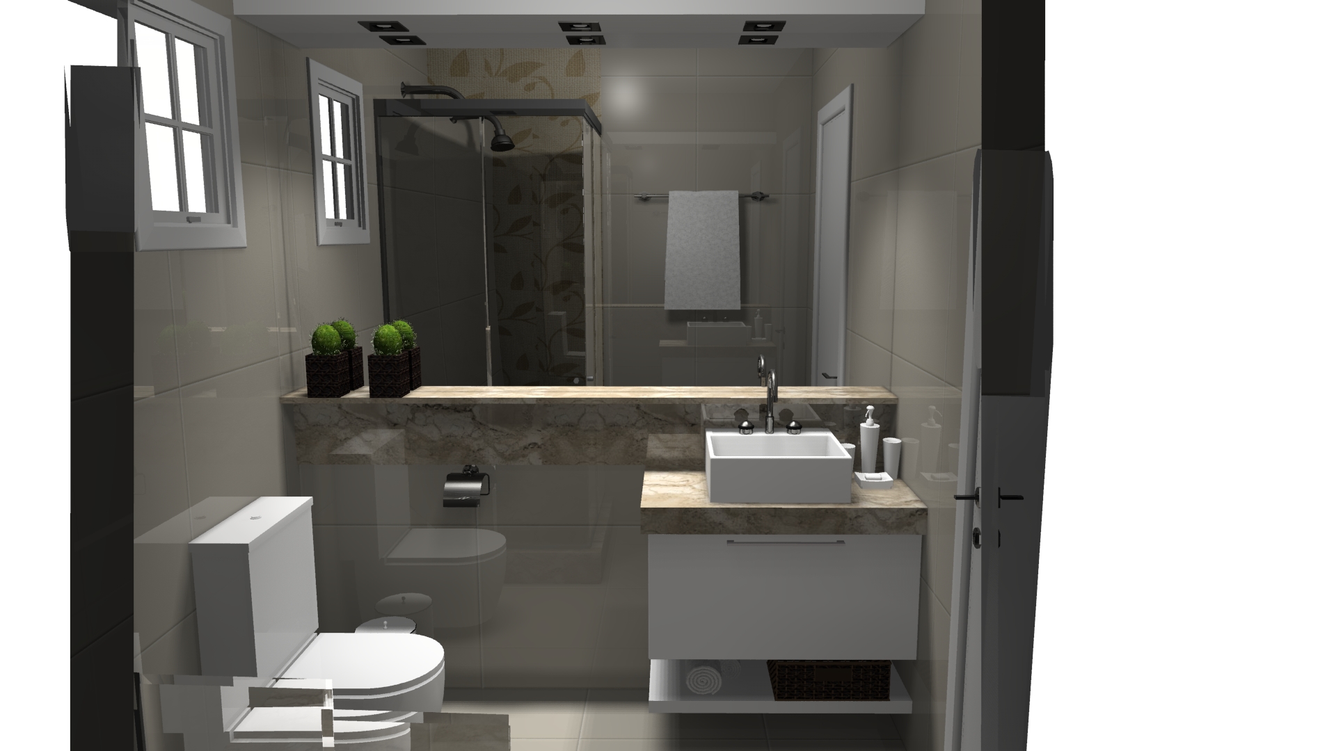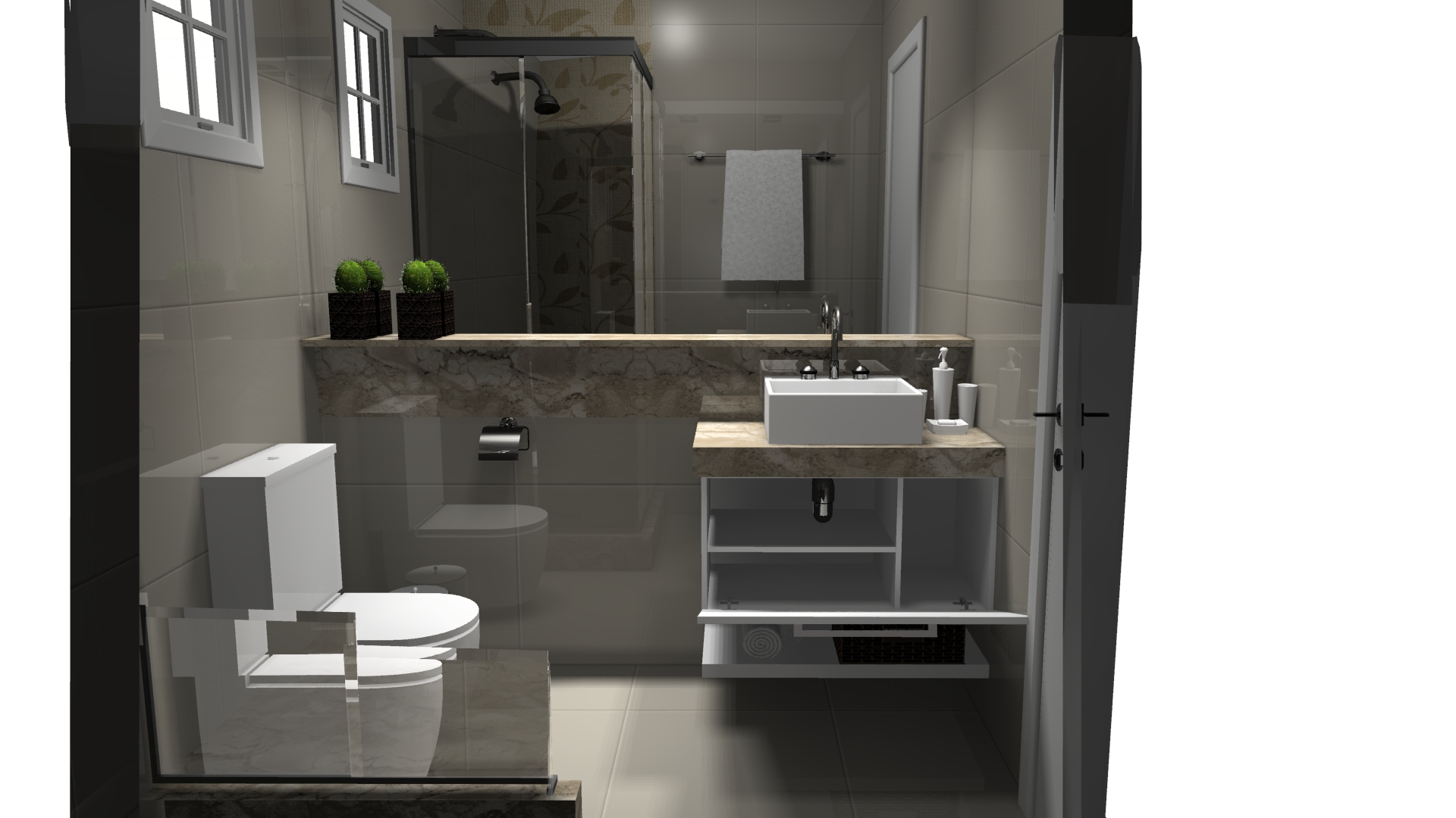 Definimos cores claras nos revestimentos, tornando o ambiente mais iluminado e para o mobiliário optamos por um tom amadeirado, com tampo em mármore travertino e cuba de apoio. O espelho contribuiu para aumentar o espaço e a iluminação quente para tornar o espaço mais aconchegante.