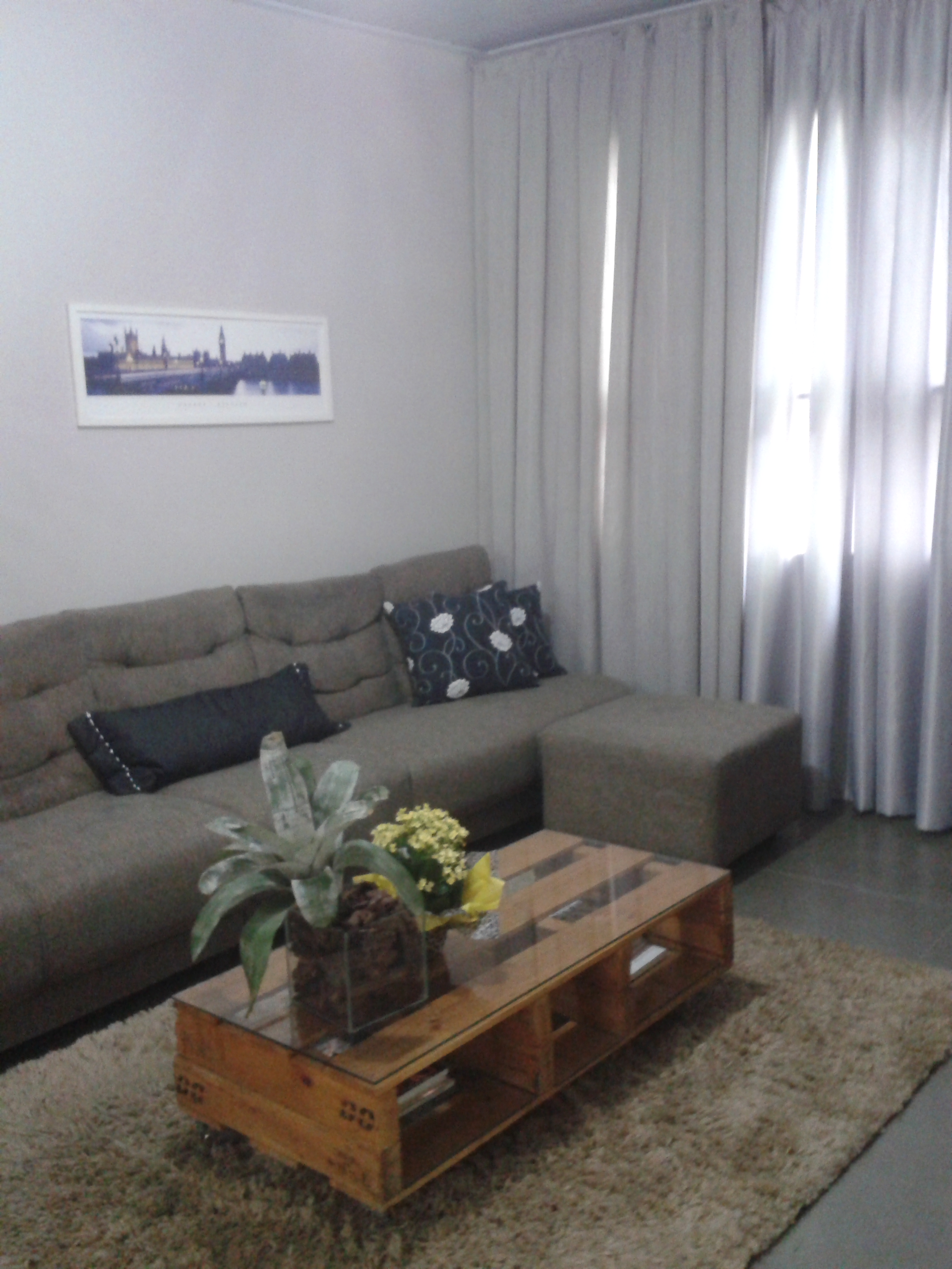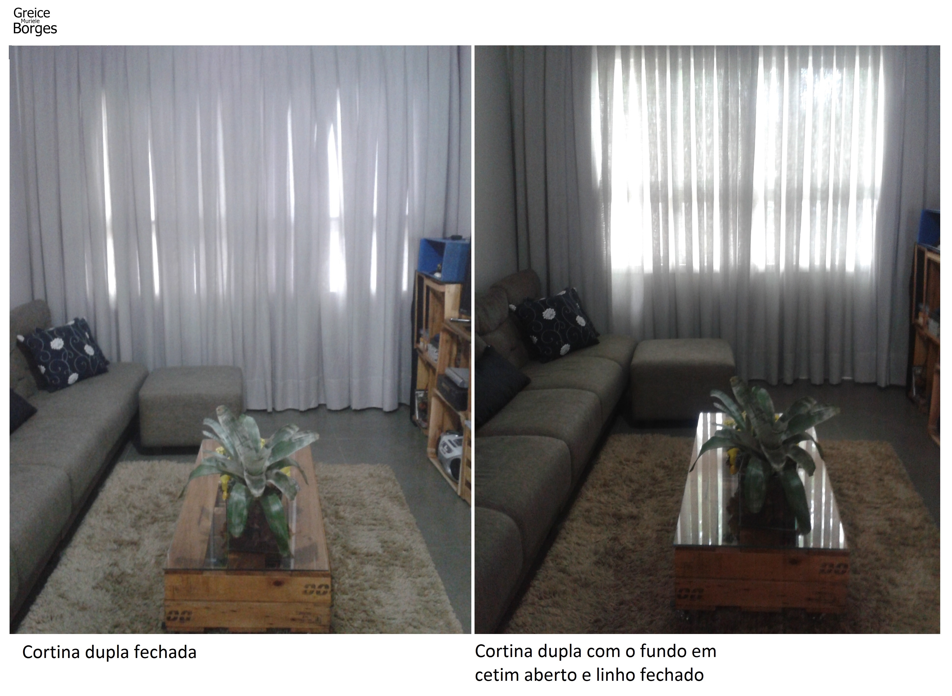 Nesta sala de estar com televisão, optei por cortina com pregas fêmeas ( tipo de acabamento)! Trilho duplo, com duas camadas de tecido, uma em cetim para bloquear a luz e a outra em falso linho, para suavizar a composição, ambas com aberturas independentes. Optamos por fechar todo o vão, para evitar que a luz “vaze” pelas laterais.