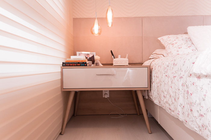 Por exemplo, para este dormitório de casal, foi utilizado uma persiana, com tecido translúcido, que permite privacidade e atenua a iluminação do ambiente, agindo como filtro de luz.