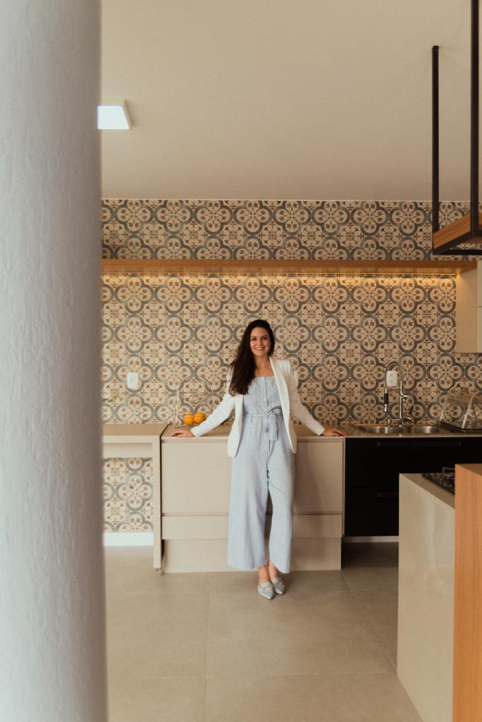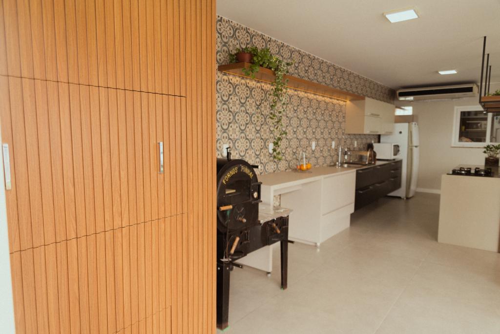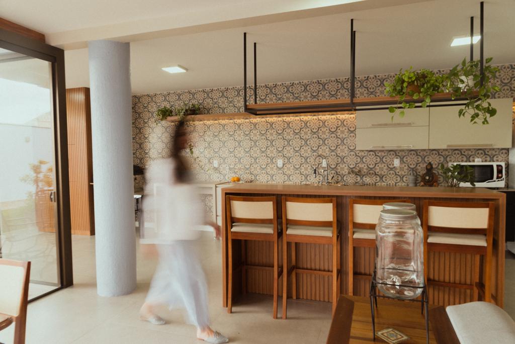 Definido o layout, partimos para a definição de estilo e revestimentos! Removemos o piso de madeira, pois apresentava muitas patologias, substituindo por um porcelanato em toda a área. Removemos os revestimentos da parede da pia, escolhendo o ladrilho mediterrâneo da Ceusa que tem tom azul bem suave, para trazer um toque de cor ao ambiente que ficaria mais neutro, tendo como protagonista a madeira presente no pergolado e mobiliário.