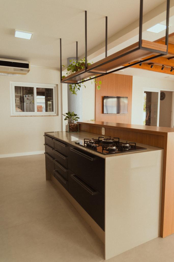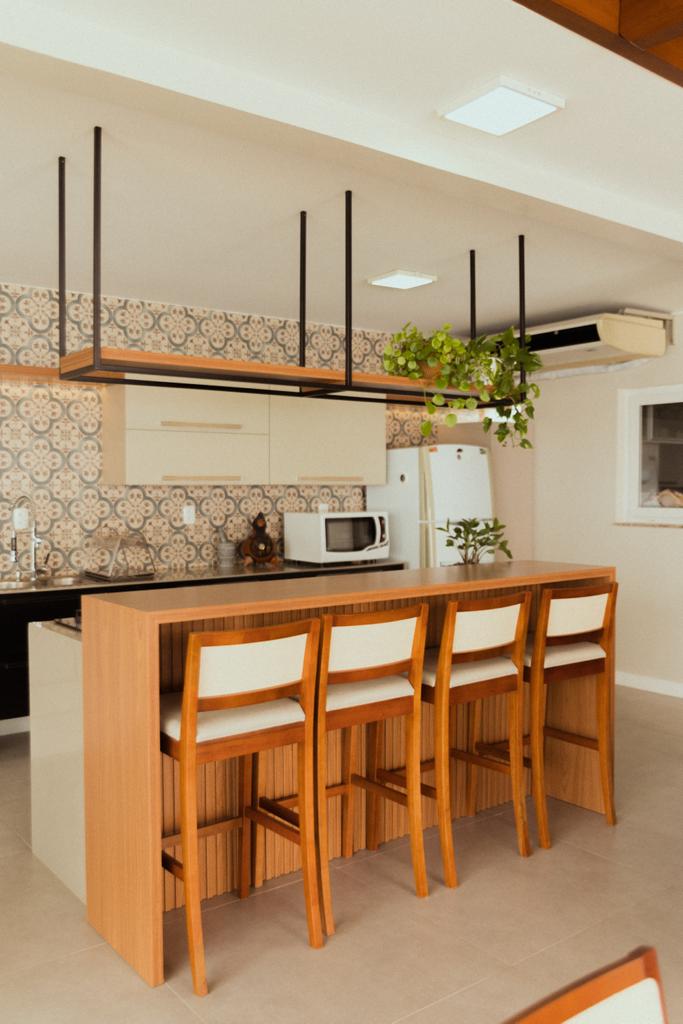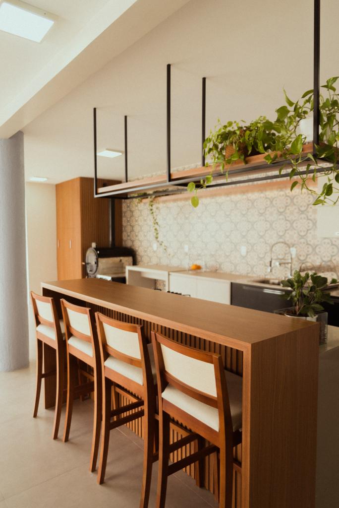 Definido o layout, partimos para a definição de estilo e revestimentos! Removemos o piso de madeira, pois apresentava muitas patologias, substituindo por um porcelanato em toda a área. Removemos os revestimentos da parede da pia, escolhendo o ladrilho mediterrâneo da Ceusa que tem tom azul bem suave, para trazer um toque de cor ao ambiente que ficaria mais neutro, tendo como protagonista a madeira presente no pergolado e mobiliário.