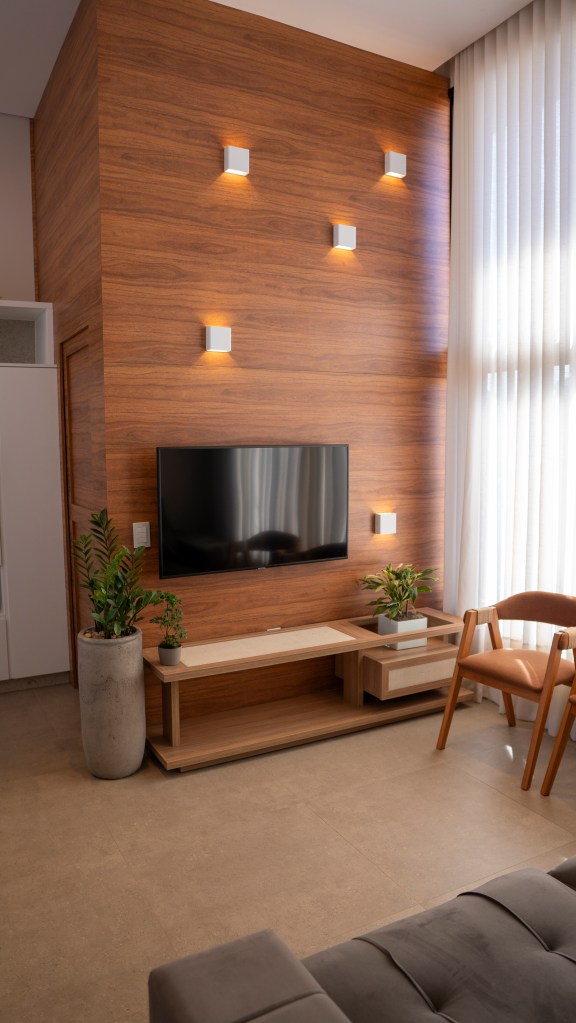 Atrás daquele painel amadeirado da TV tem a lavanderia da casa, compacta e pertinho da cozinha para ser funcional, com uma janela bem grande, pra ventilar e secar roupas ali mesmo, prática, como a vida pode ser!