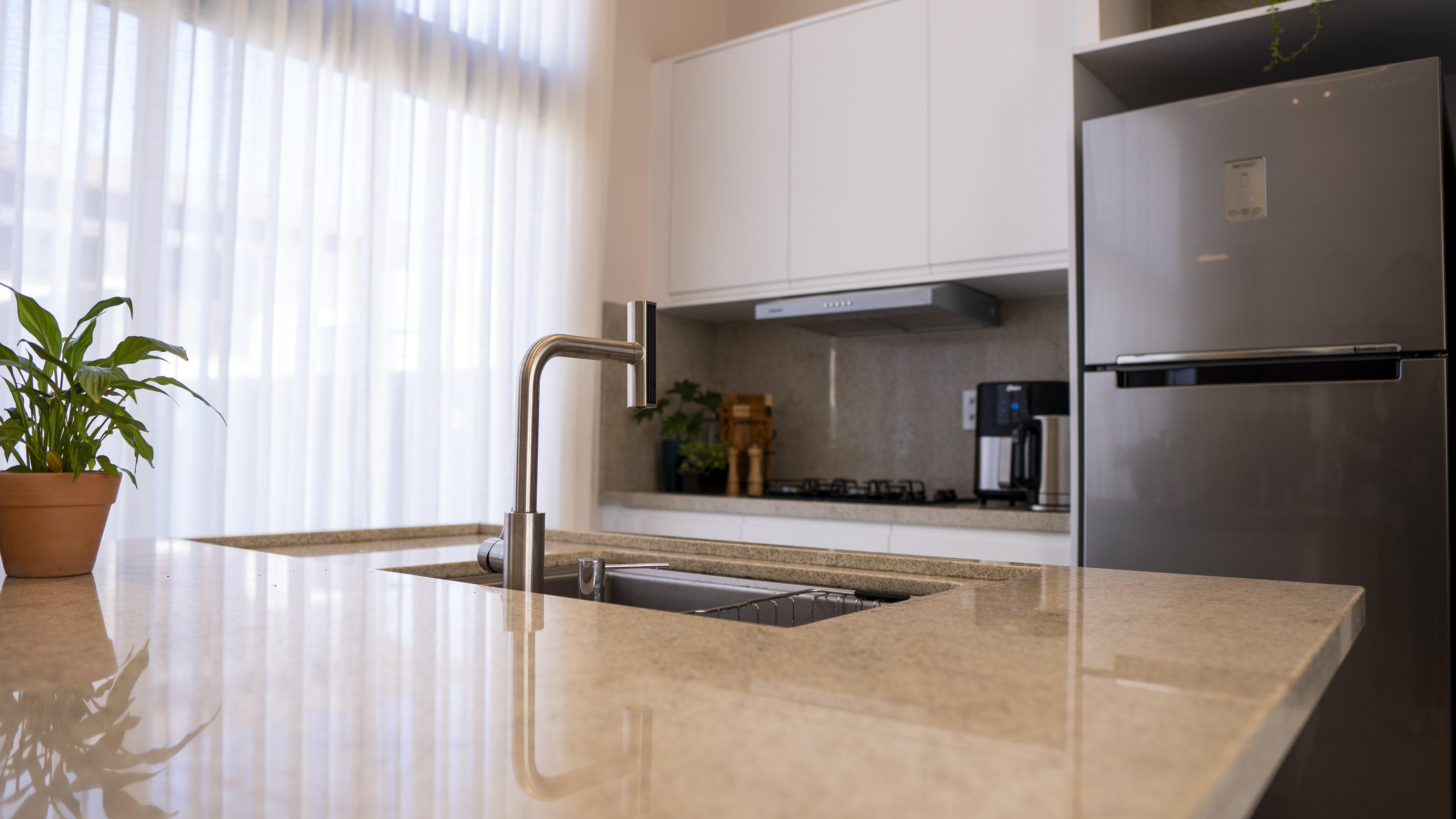 Definimos a parede ao fundo para os armários altos, com um despenseiro, torre de fornos, refrigerador e gavetas! O aéreo acima do cooktop oculta o depurador e a exaustão direta para a rua, além de armazenar toda a louça!