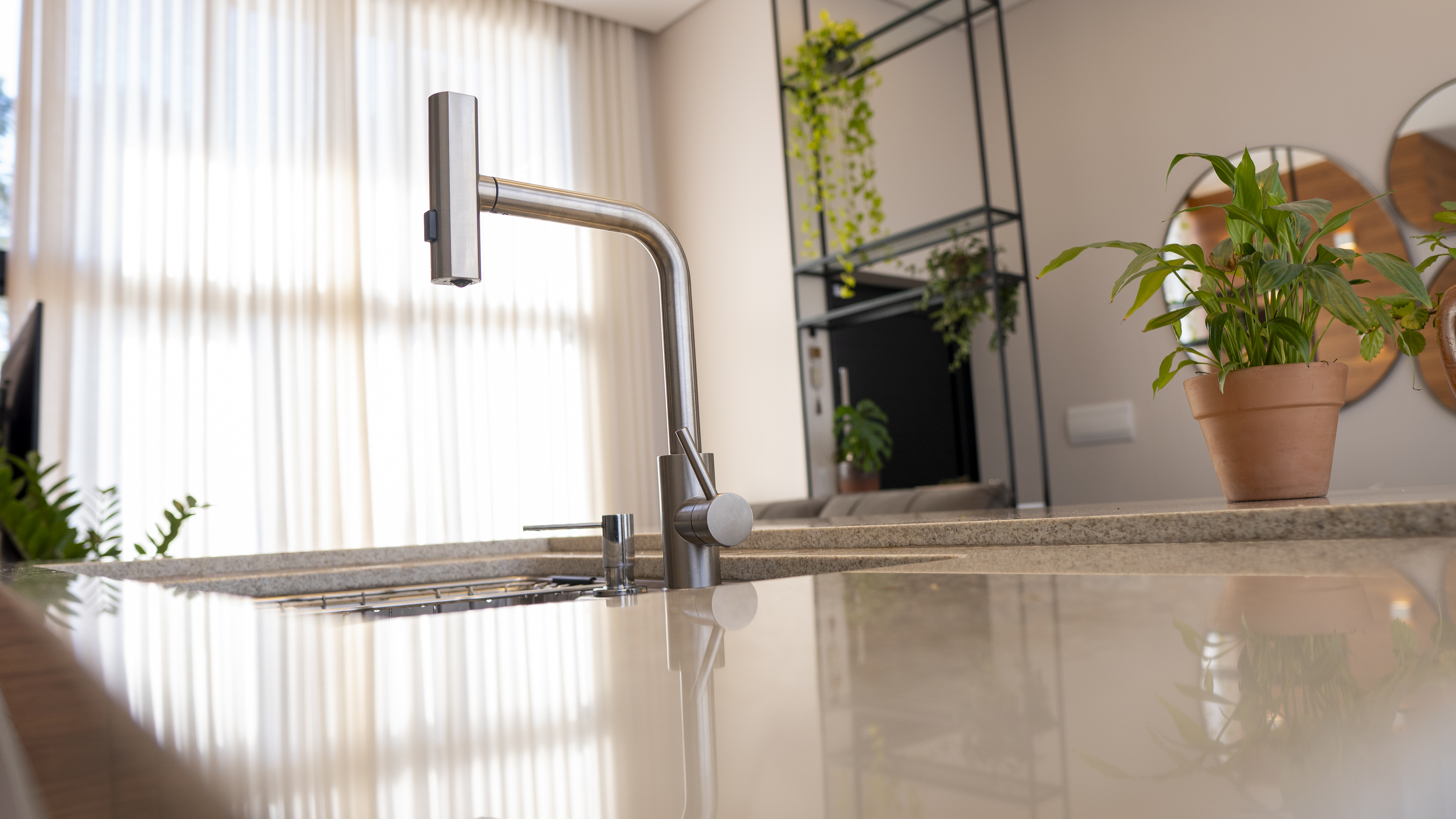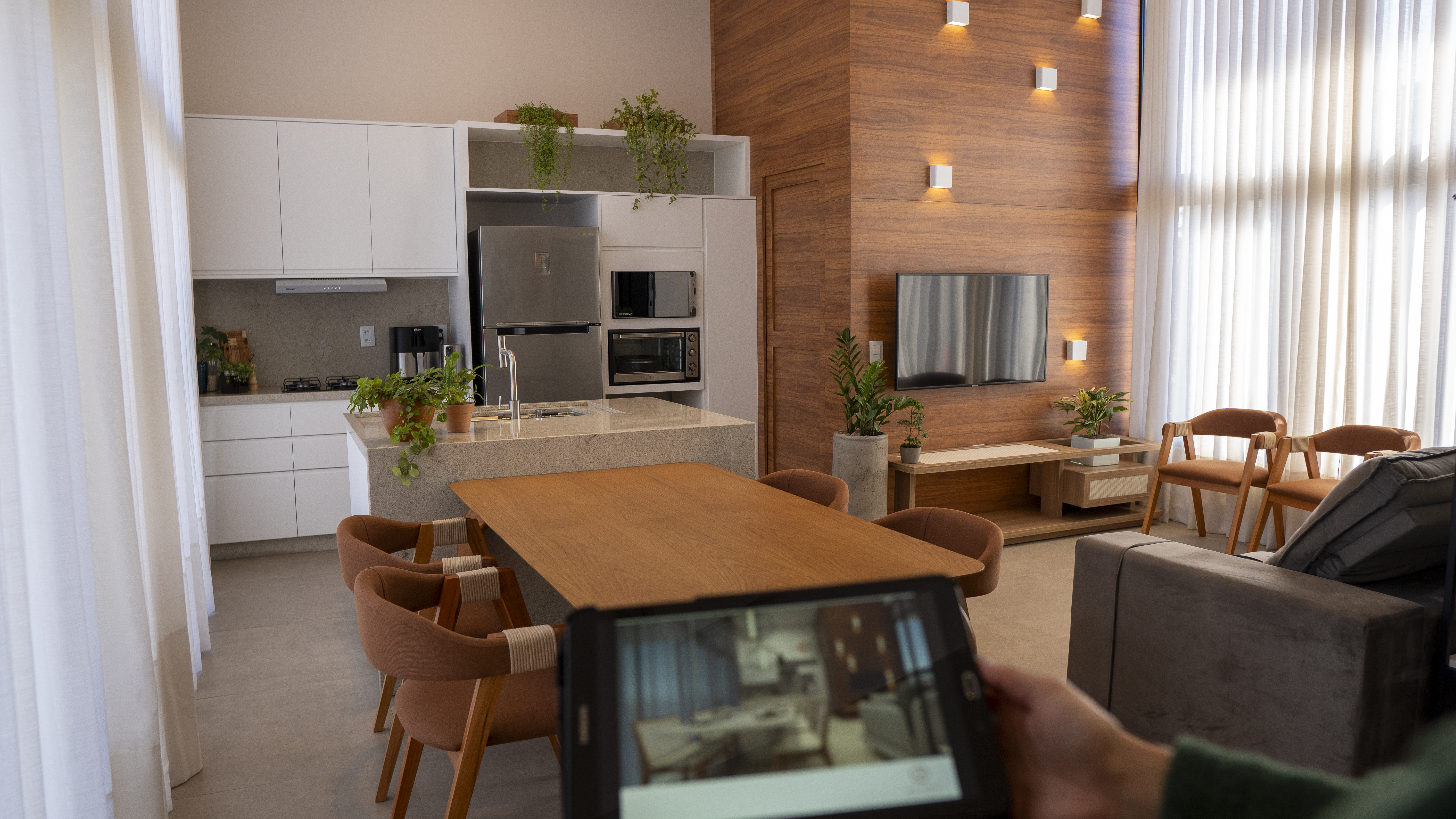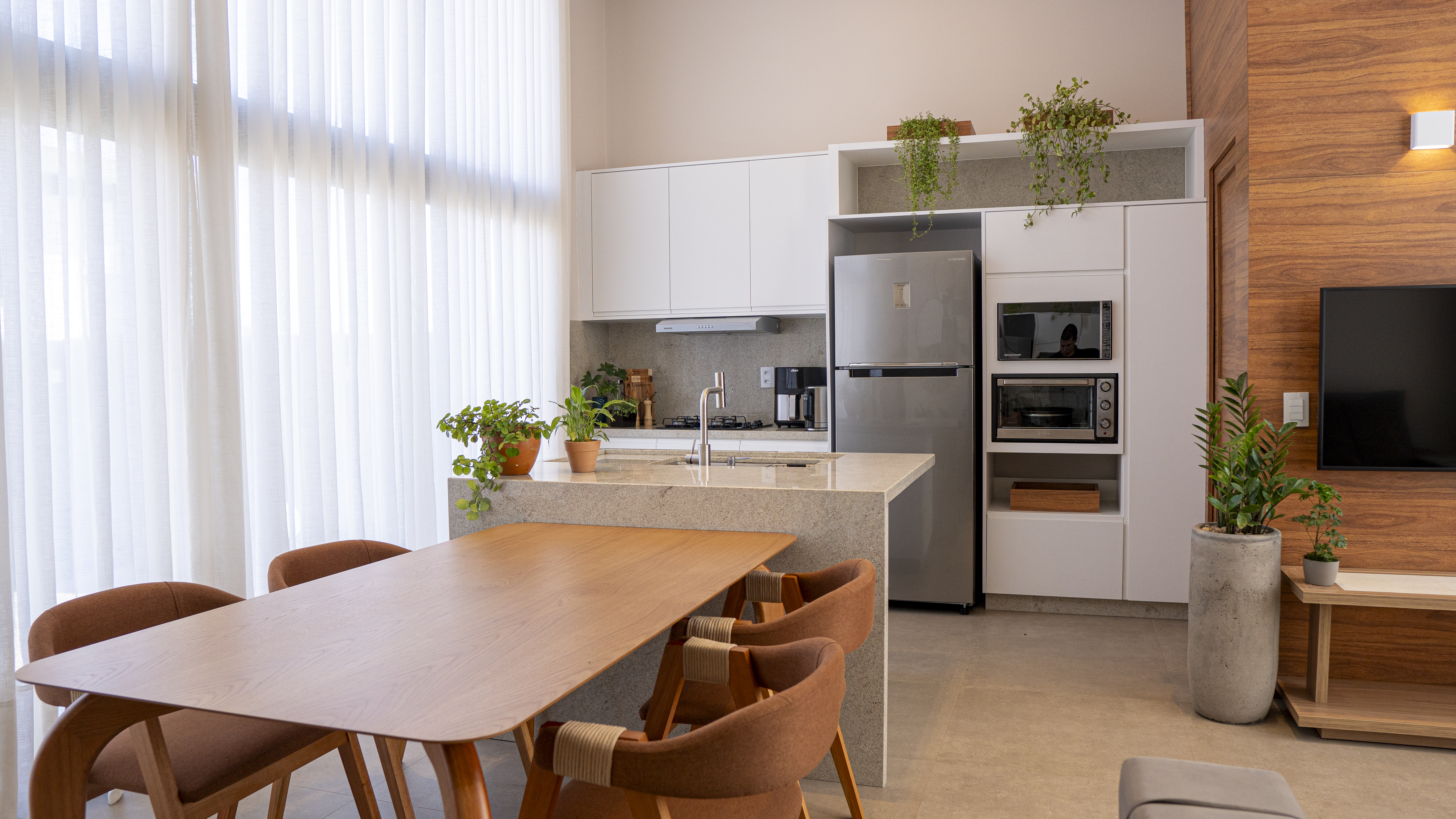 Atrás daquele painel amadeirado da TV tem a lavanderia da casa, compacta e pertinho da cozinha para ser funcional, com uma janela bem grande, pra ventilar e secar roupas ali mesmo, prática, como a vida pode ser!